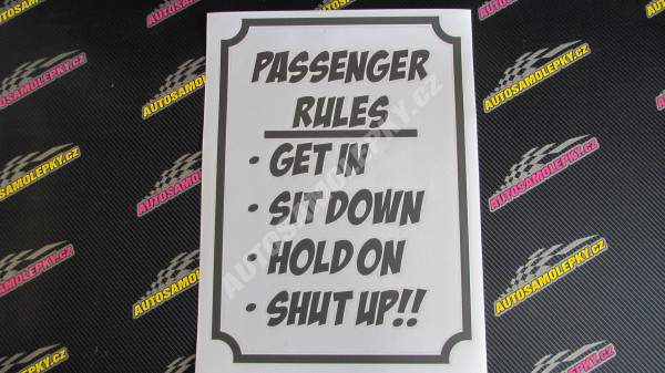 Passenger rules nápis pravidla pro cestující originální samolepka na auto Nápisy - anglický text